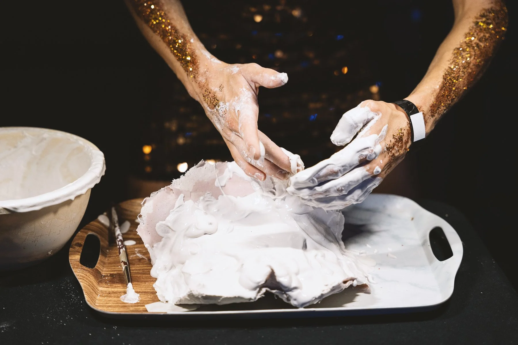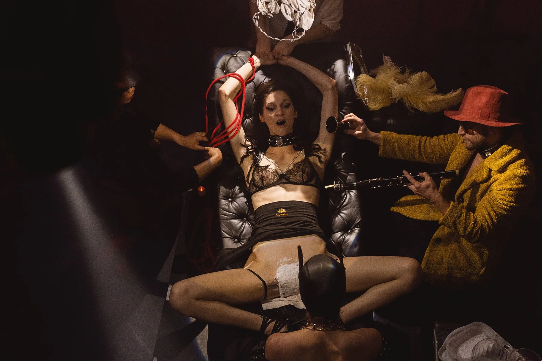 A multi-disciplinary performance composed of a dancer, a dominatrix dog-woman and a musician trapped between horizontal harp and an awkward clarinet. They all danced around a beautiful young woman who lay nude on a button tufted leather sofa. As the scene unraveled, molding gel was being applied between her legs.